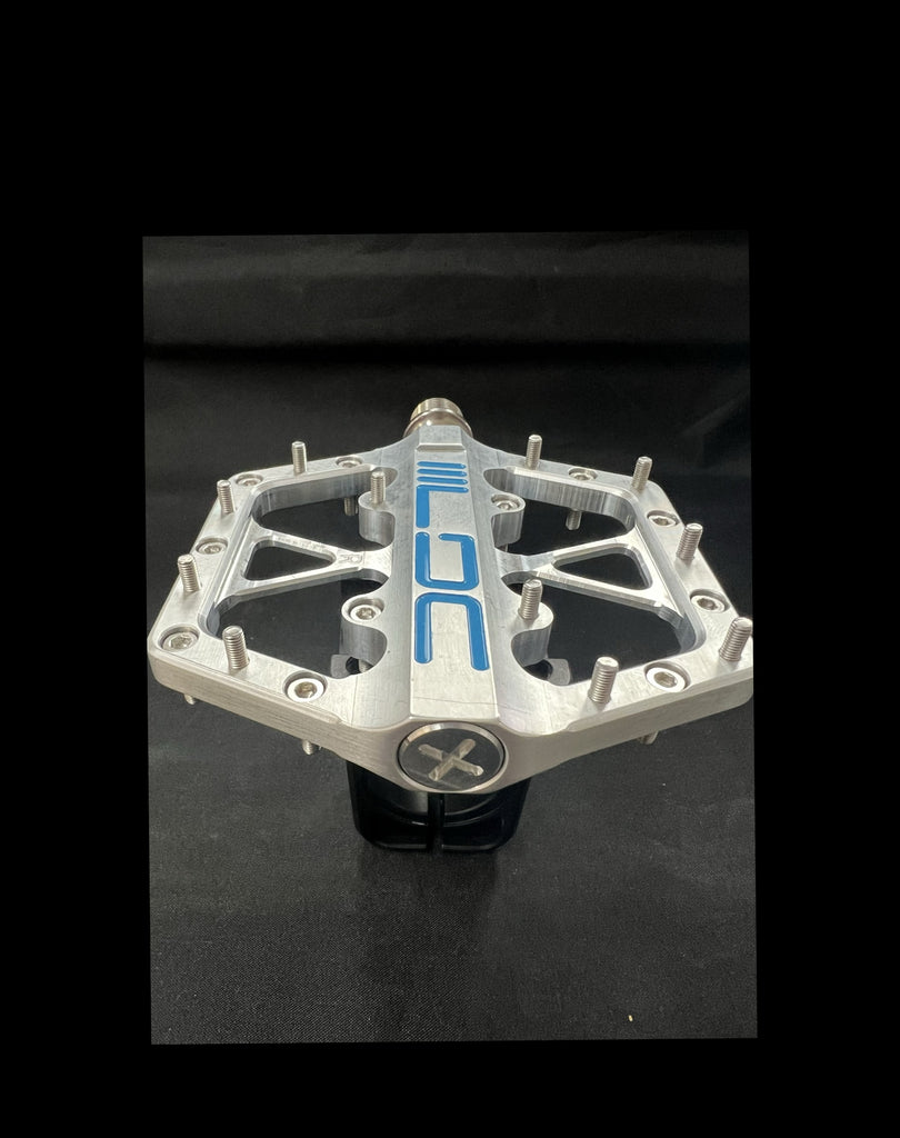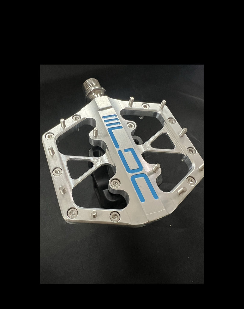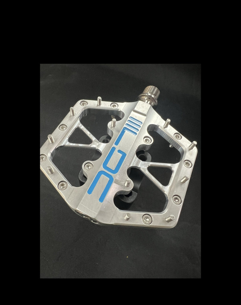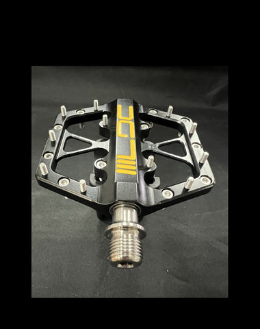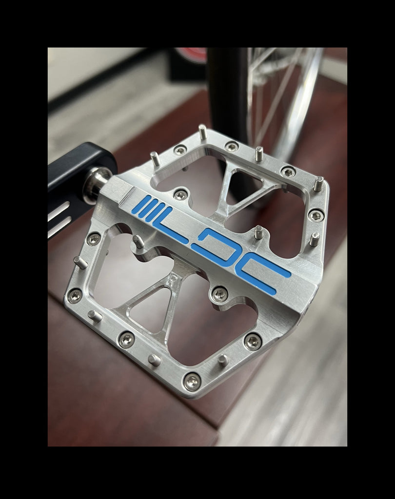 The LDC race pedal is designed for our sport of BMX racing. It features a CNC machined body out of aircraft grade aluminum, titanium spindle and uses a 3 bearing design. We feel our pedal will offer the best performance in a platform pedal in our sport. There are 11 grip pins per side and are available in either 8mm or 10mm, which will provide a high amount of grip between the pedal and the shoe. Platform size is 93 x 89mm. Weight per set is 270 grams.